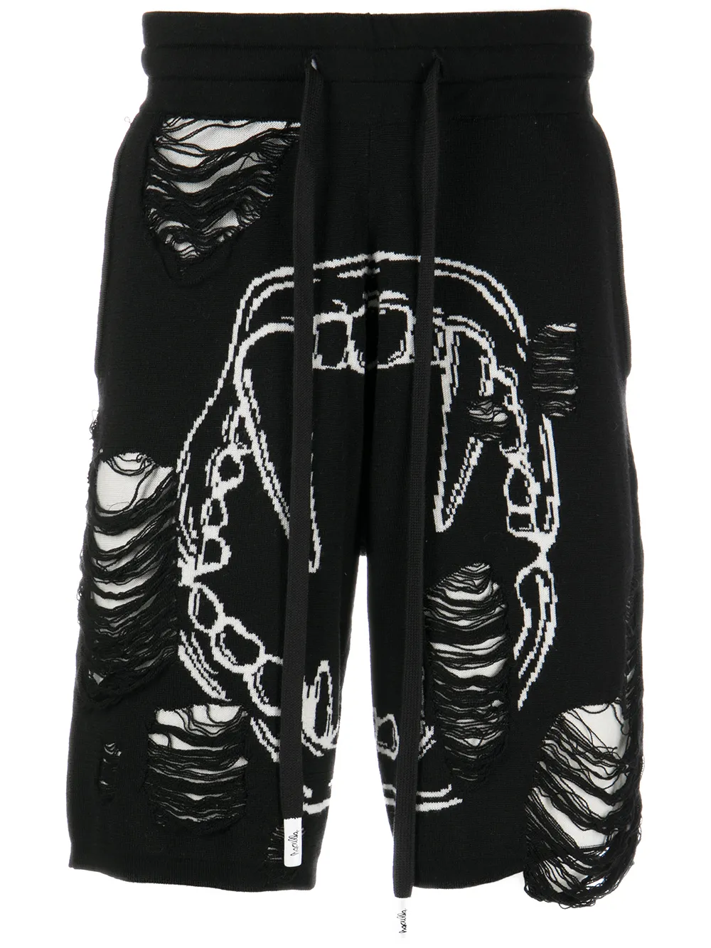Noir/blanc, laine, design en maille, effet usé, maille intarsia, taille élastique à lien de resserrage, hauteur genou, deux poches latérales fendues, poches arrière passepoilées.