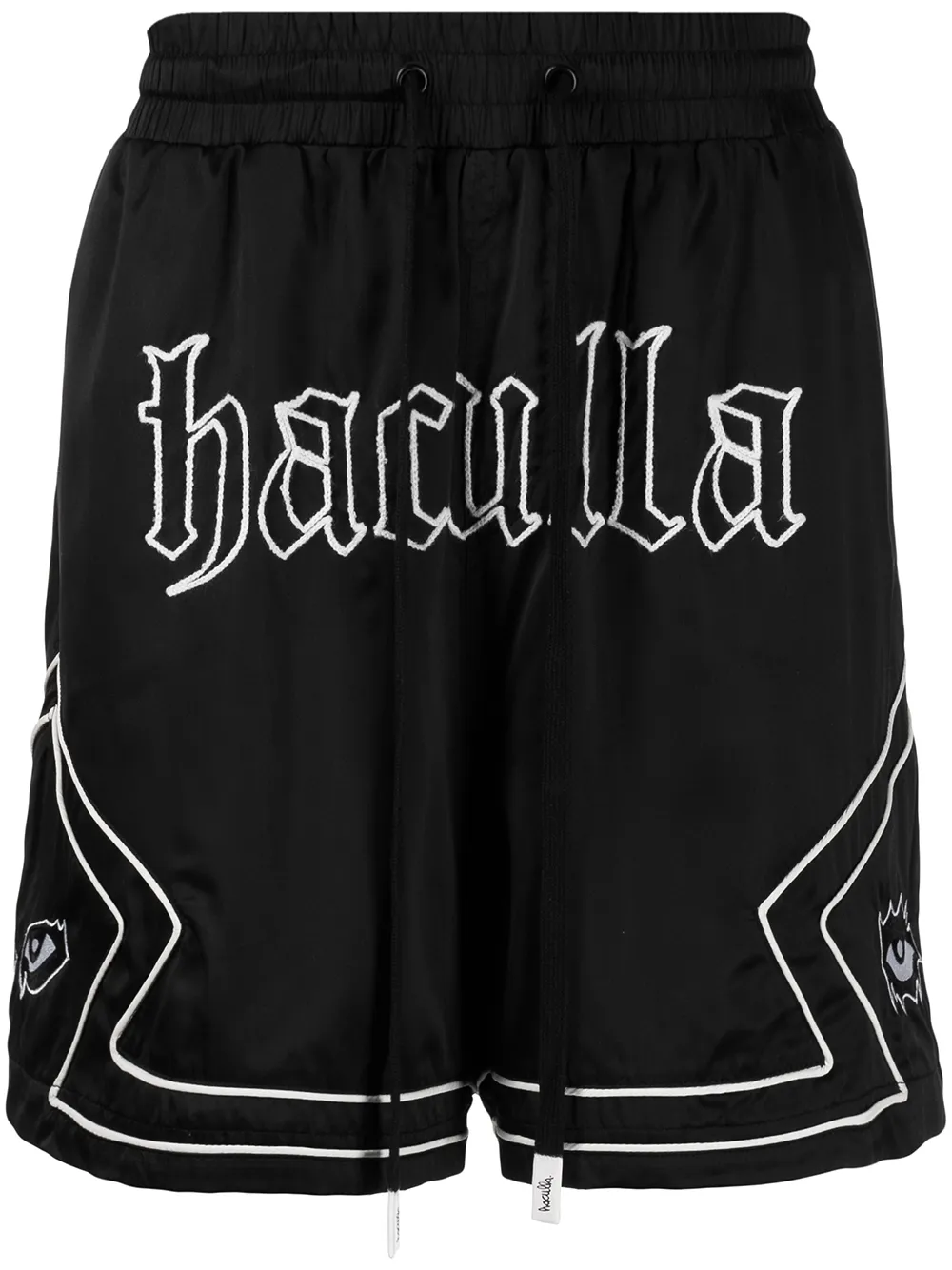 Motif brodé, taille haute, taille élastique à lien de resserrage, deux poches latérales fendues.