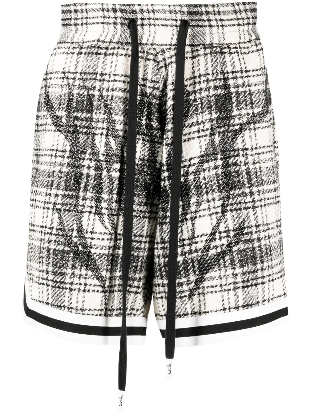 Noir, blanc crème, coton, carreaux Plaid, imprimé flamme, tweed, bordures rayées, taille élastique à lien de resserrage, poches latérales fendues, ourlet élastiqué, coupe droite.