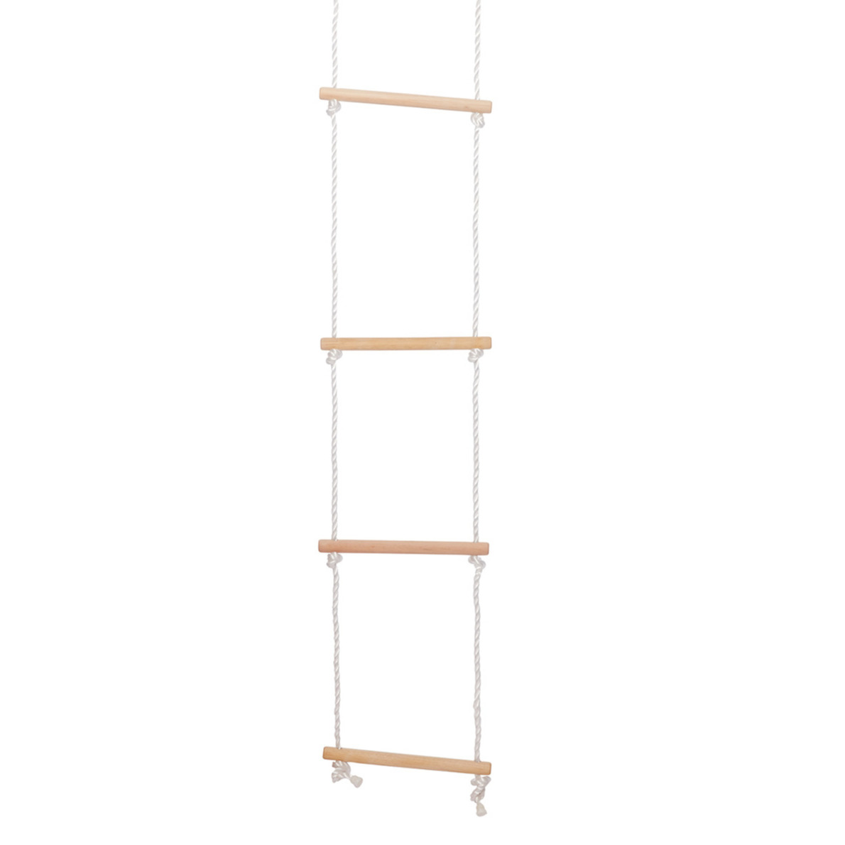 Kinder touwladder/klimladder 2 meter. Een stevig touwladder met 5 treden van 32 cm breed die aan elkaar zitten met een stevig polyester touw. Deze touwladder/klimladder is geschikt voor maximaal 60 kilo. Leeftijd: 3 jaar en ouder. Formaat: ongeveer 200 x 32 cm. Materiaal: hout/polyester. Lengte touw: verstelbaar tot ongeveer 180 cm. Dikte touw: ongeveer 1 cm. Wordt geleverd met metalen bevestigingsring.