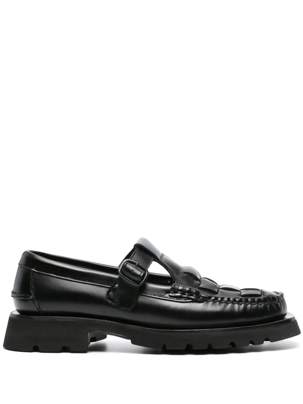 Noir, cuir de veau, bout carré, fermoir en T, semelle intérieure griffée, semelle crantée en caoutchouc.