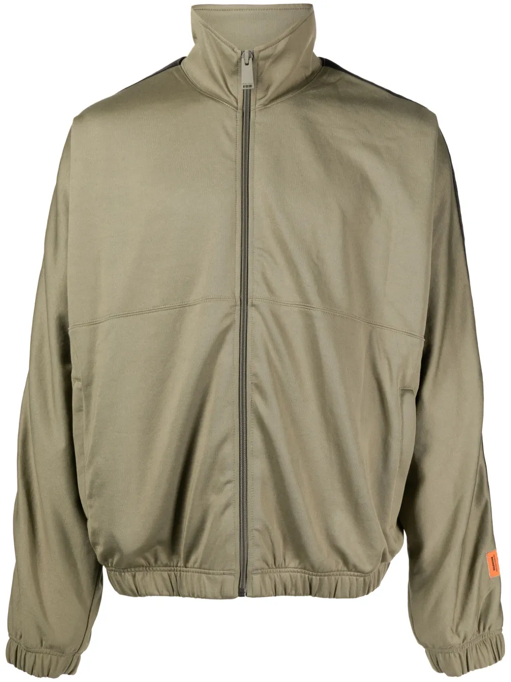 Vert olive, coton mélangé, col montant, fermeture zippée devant, détails de coutures apparentes, patch logo sur la manche, poche latérale passepoilée, manches longues, poignets élastiqués, ourlet élastiqué.
