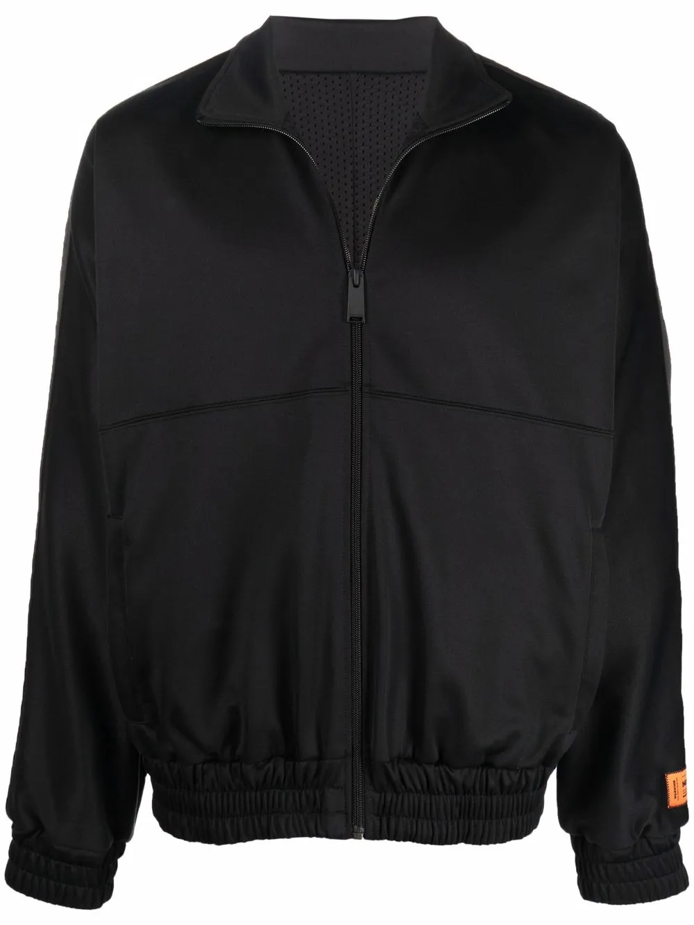 noir coton détail de rayure latérale patch logo sur la manche col montant manches longues fermeture zippée devant deux poches latérales fendues ourlet élastiqué