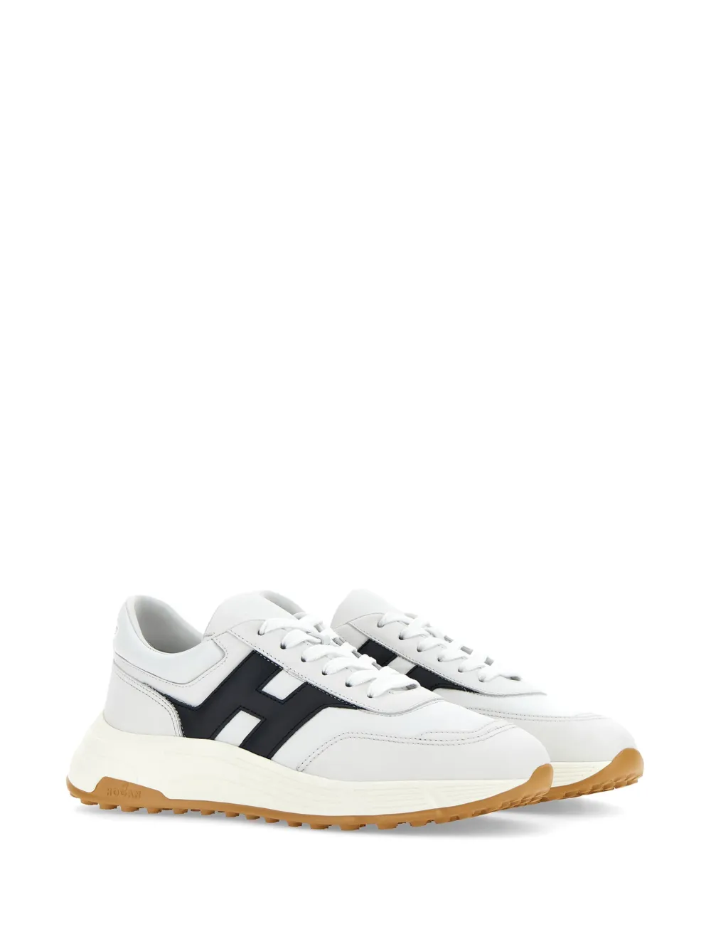 wit kalfsleer veters aan voorkant binnenzool met logo zijvlakken verfraaid met logo ronde neus rubberen zool