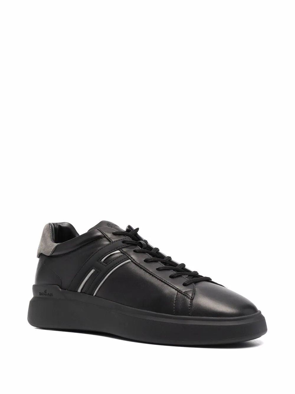 Vetersluiting aan de voorkant, ronde neus, binnenzool met logo en platte rubberen zool.