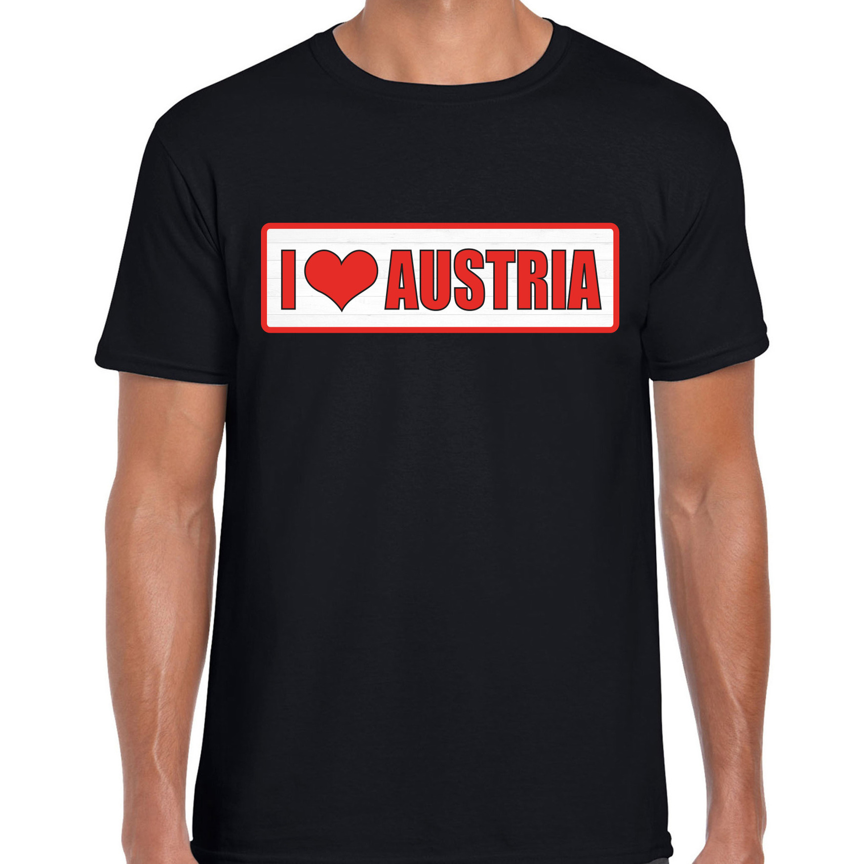 I love Austria / Oostenrijk landen t-shirt zwart voor heren. Op dit zwarte shirt staat een bordje met de tekst: I HARTJE AUSTRIA / I LOVE OOSTENRIJK. Het bordje en het hartje hebben de kleuren van de Oostenrijkse vlag!