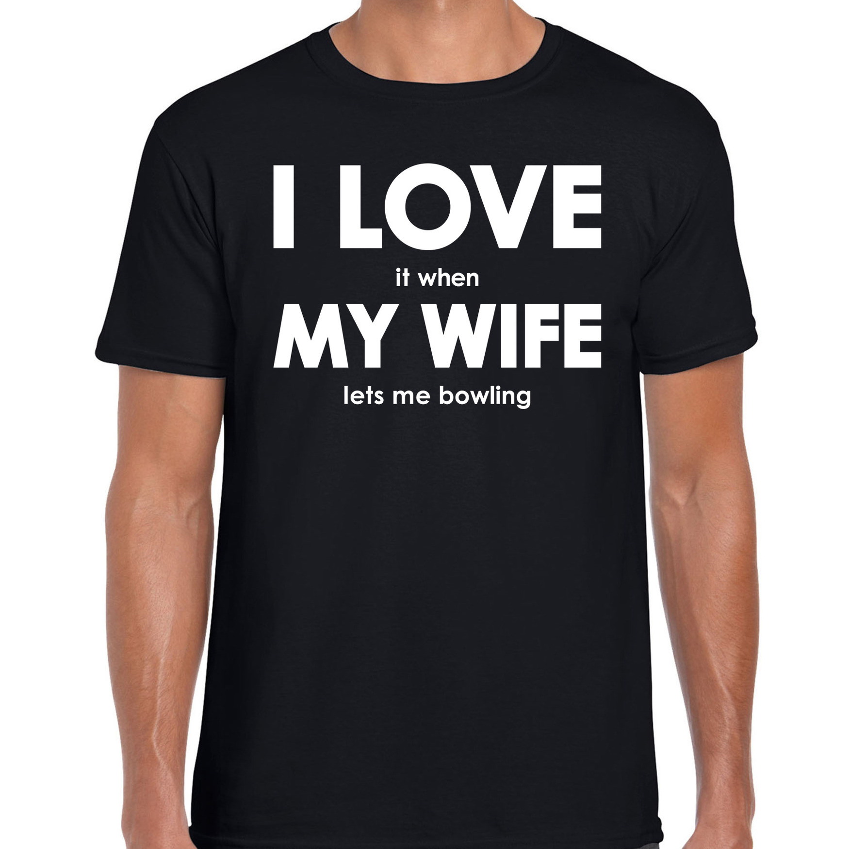 I love it when my wife lets me bowling cadeau t-shirt zwart heren. Op dit zwarte shirt staat in witte letters de grappige tekst: I LOVE it when MY WIFE lets me bowling. Materiaal: 150 grams, 100% katoen. Grappig Vaderdag cadeau shirt voor een echte bowler, of als origineel cadeau voor je echtgenoot met bowling/bowlen als hobby/ sport.