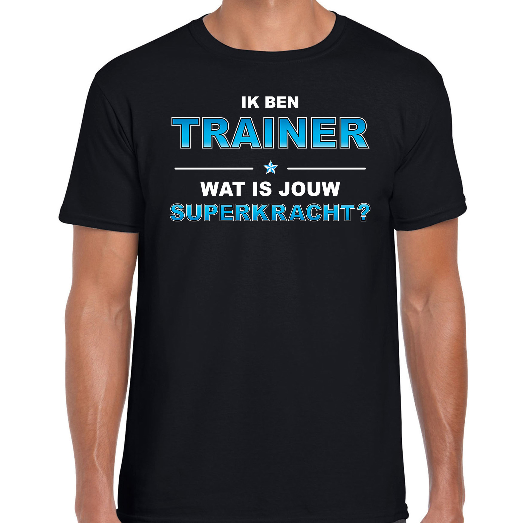Cadeau shirt trainer – ik ben trainer wat is jouw superkracht t-shirt zwart voor heren. Op dit zwarte shirt staat in blauwe letters de tekst: ik ben trainer, wat is jouw superkracht? Het t-shirt is leuk om cadeau te geven voor de trainer zijn verjaardag, of als bedankje aan het einde van een (sport) seizoen.