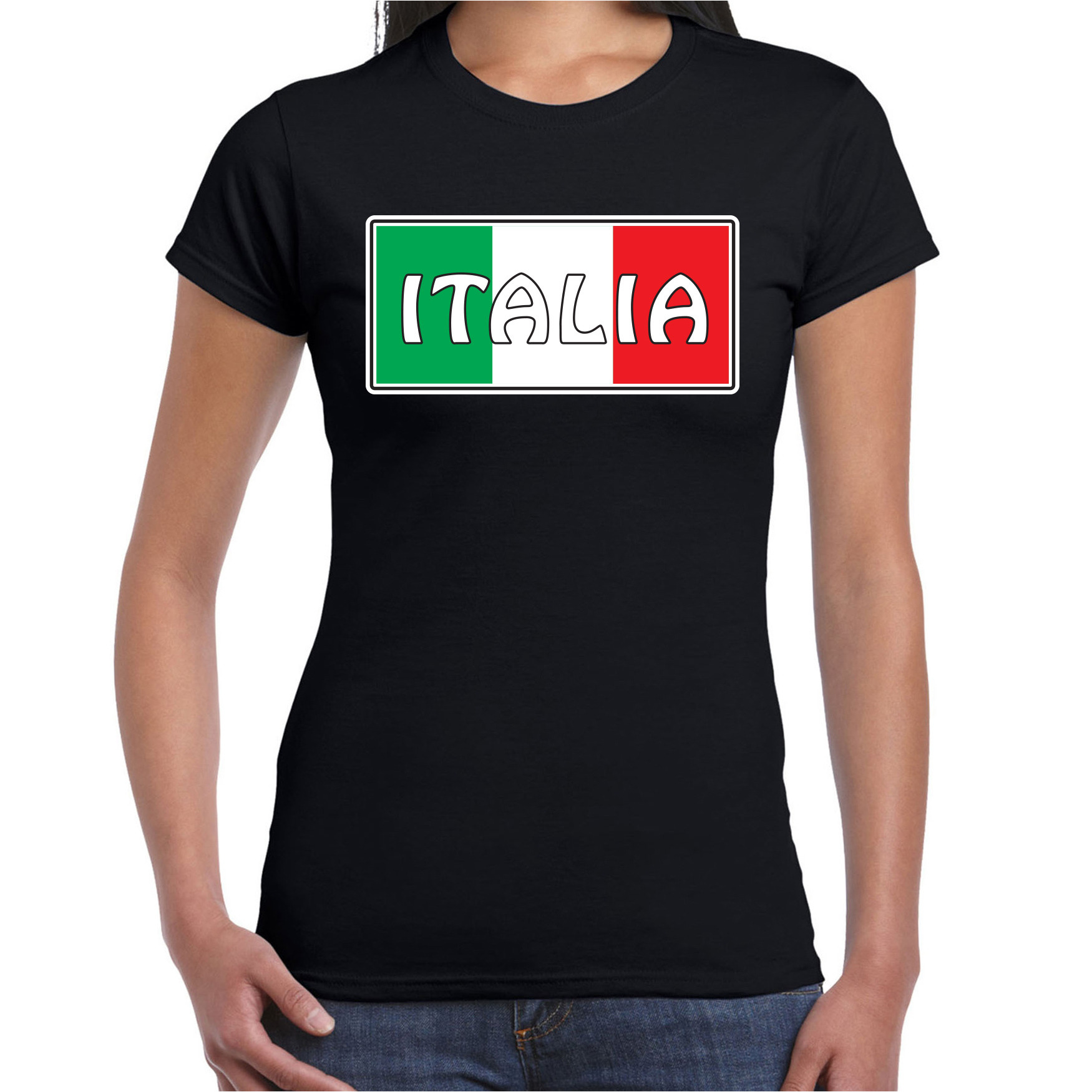 Italie / Italia landen t-shirt zwart voor dames. Op dit zwarte shirt staat een bordje met de tekst: ITALIA. Het bordje heeft de kleuren van de Italiaanse vlag!