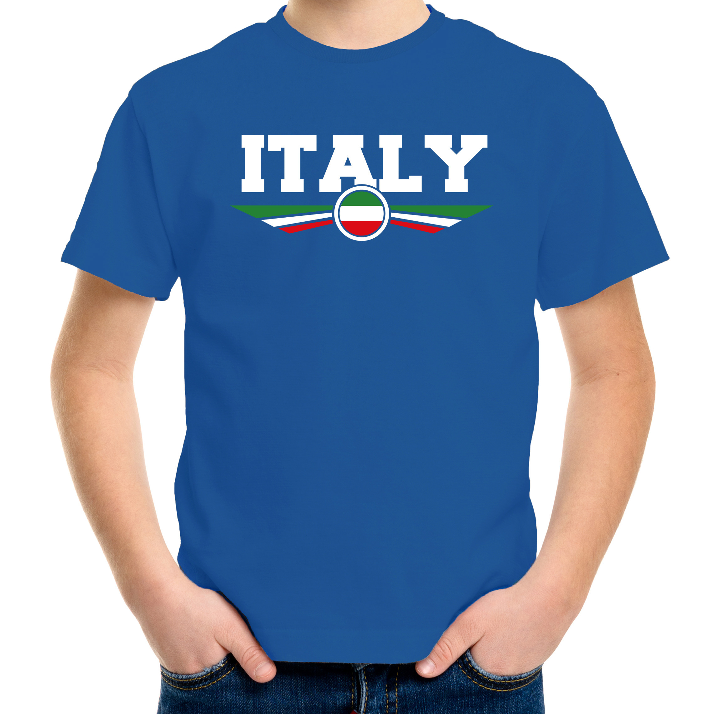Italie / Italy landen t-shirt blauw voor kids. Op dit blauwe shirt met wapen staat in grote letters de tekst: ITALY. Het wapen heeft de kleuren van de Italiaanse vlag!