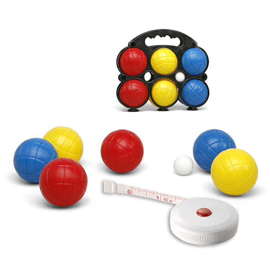 Deze jeu de boules set bevat 6 kunststof ballen en een markeringsballetje + een compact meetlint van 1,5 meter. De ballen hebben 3 verschillende kleuren. Met het compacte meetlint kan je nauwkeurig meten wie er gewonnen heeft.