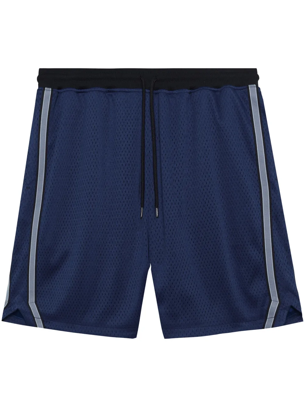 bleu marine design en résille détail de rayure latérale taille élastique à lien de resserrage coupe droite fentes latérales longueur au dessus du genou