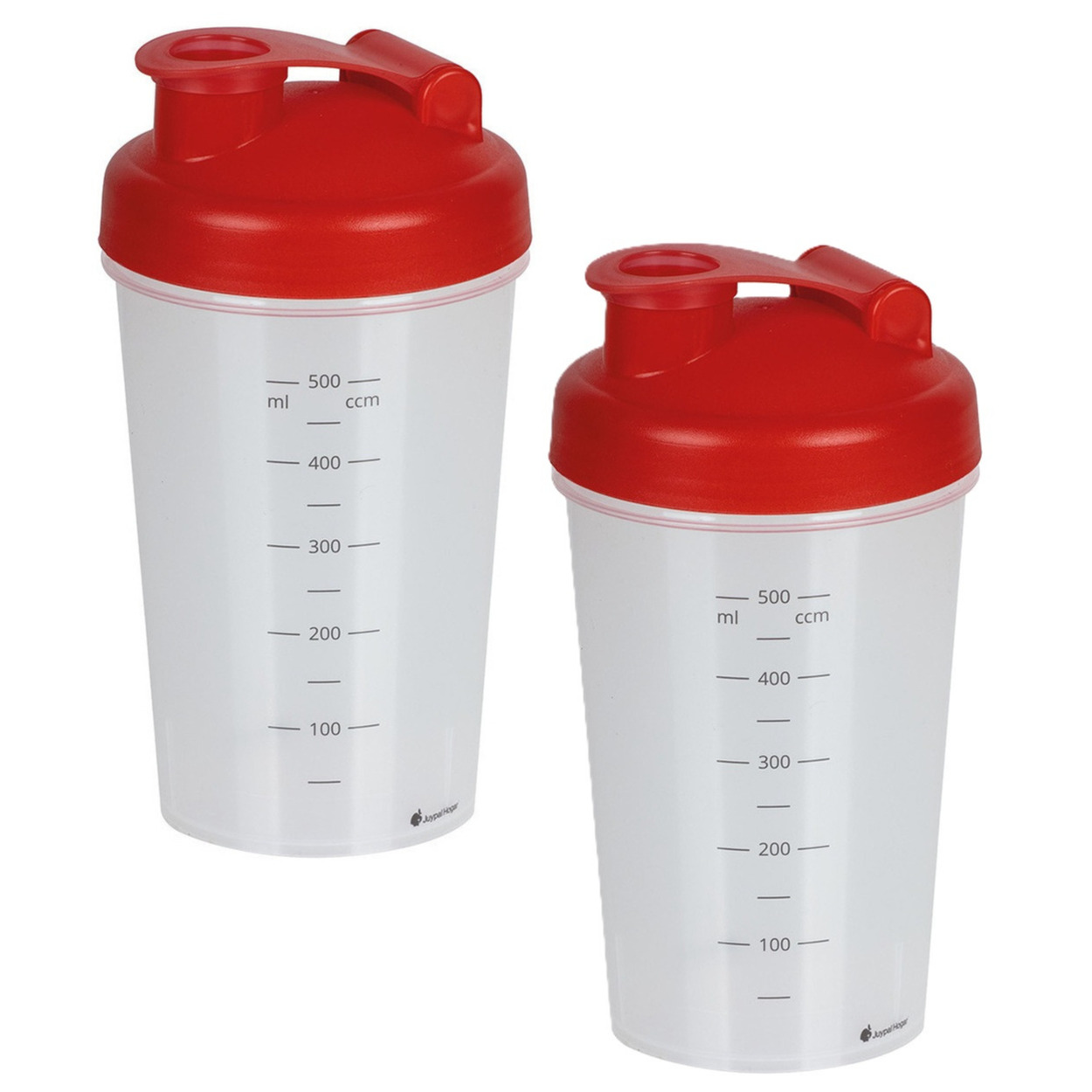 2x shakebeker/Shaker/Bidon met handige druksluiting/dop in de kleur rood. Deze beker heeft een afmeting van circa D9,5 x H18 cm en een inhoud van circa 600 ml. Gemaakt van kunststof (polypropylene, 100% BPA-vrij), geschikt voor in de magnetron en vaatwasser (tot 100 graden Celsius).handige multifunctionele drinkfles voor shakes, sapjes en/of water. Voor recreatie en/of sport.
