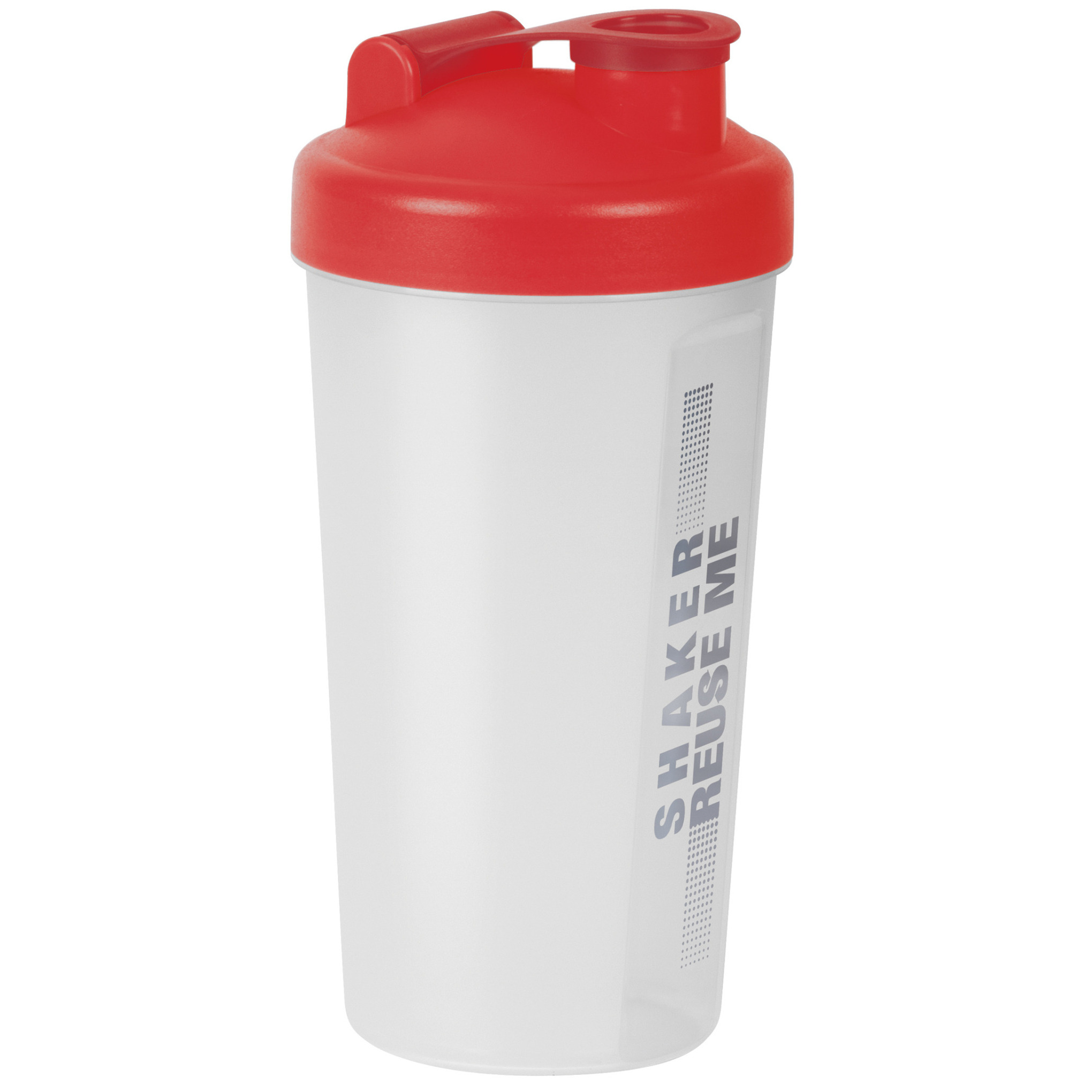 Shakebeker/Shaker/Bidon met handige druksluiting/dop in de kleur rood. Deze beker heeft een afmeting van circa D9,5 x H20 cm en een inhoud van circa 700 ml. Gemaakt van kunststof (polypropylene, 100% BPA-vrij), geschikt voor in de magnetron en vaatwasser (tot 100 graden Celsius).handige multifunctionele drinkfles voor shakes, sapjes en/of water. Voor recreatie en/of sport.