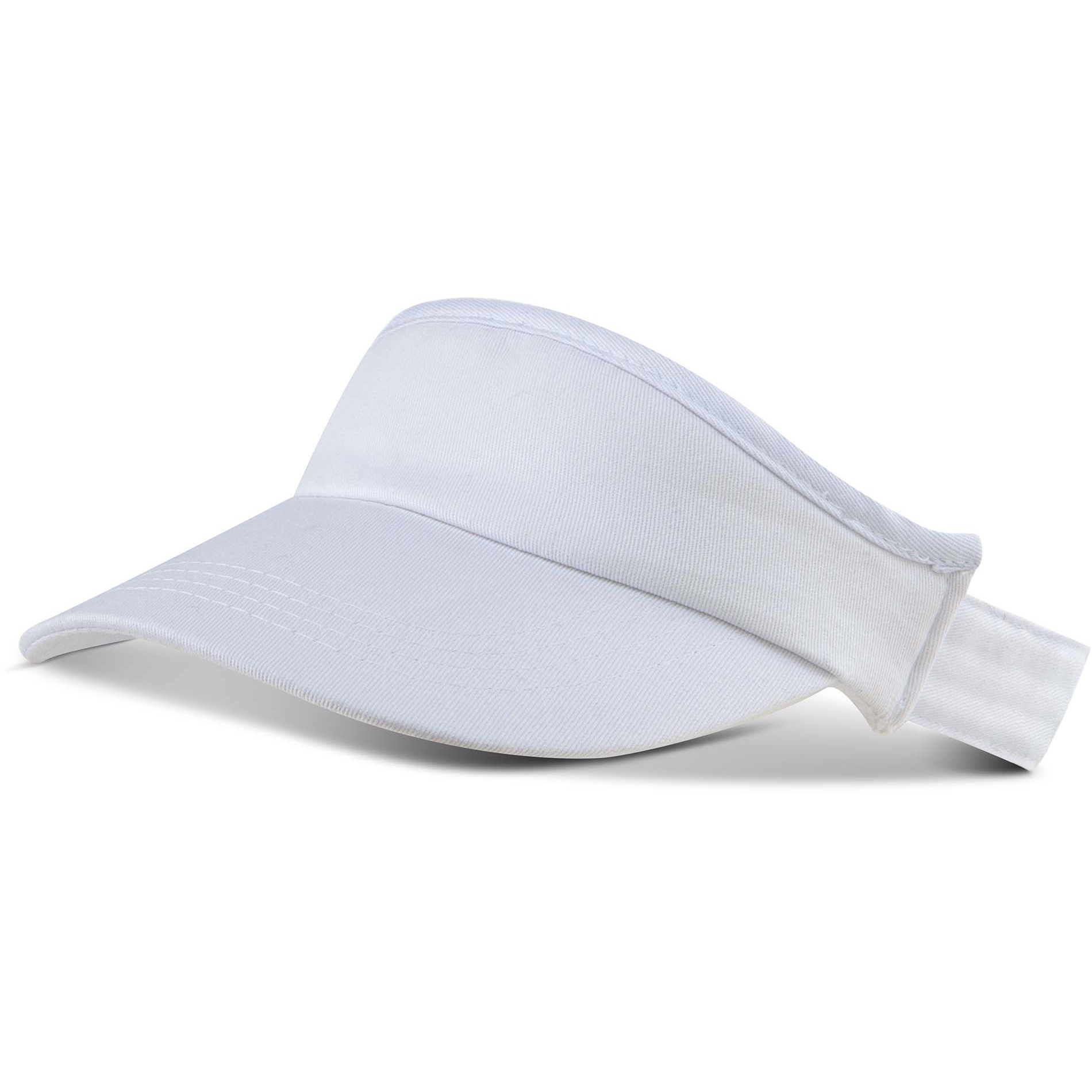 Sunvisor zonneklep voor volwassenen in het wit. Deze zonneklep heeft een gebogen klep en een badstofvoering aan de binnenzijde. De hoofdmaat is verstelbaar met klittenband aan de achterzijde.