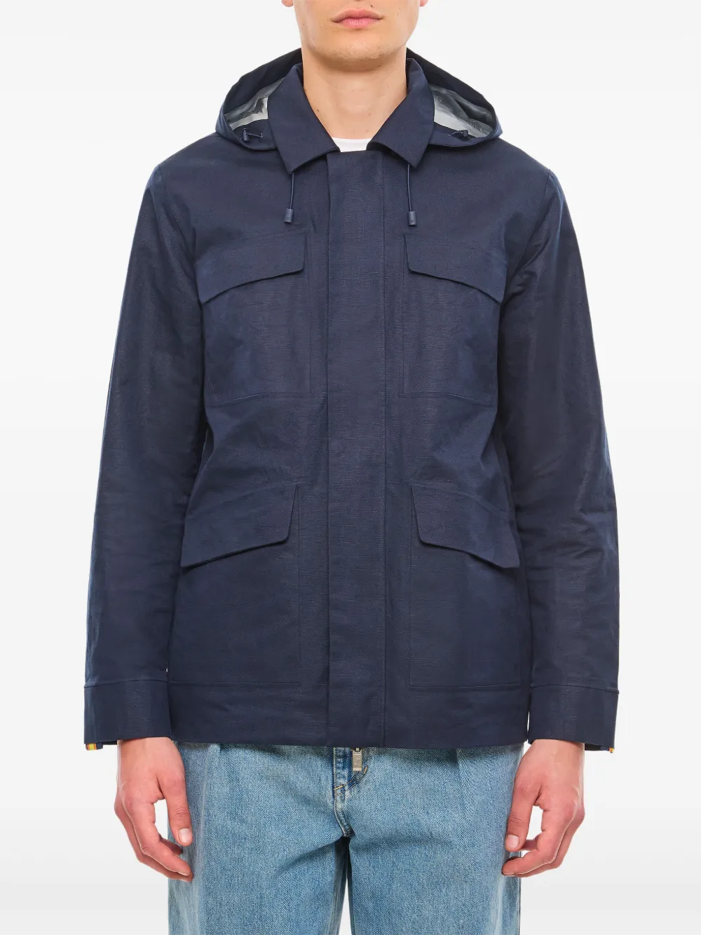 bleu marine fermeture dissimulée sur le devant fermeture dissimulée à boutons pression capuche à lien de resserrage poches devant à rabat