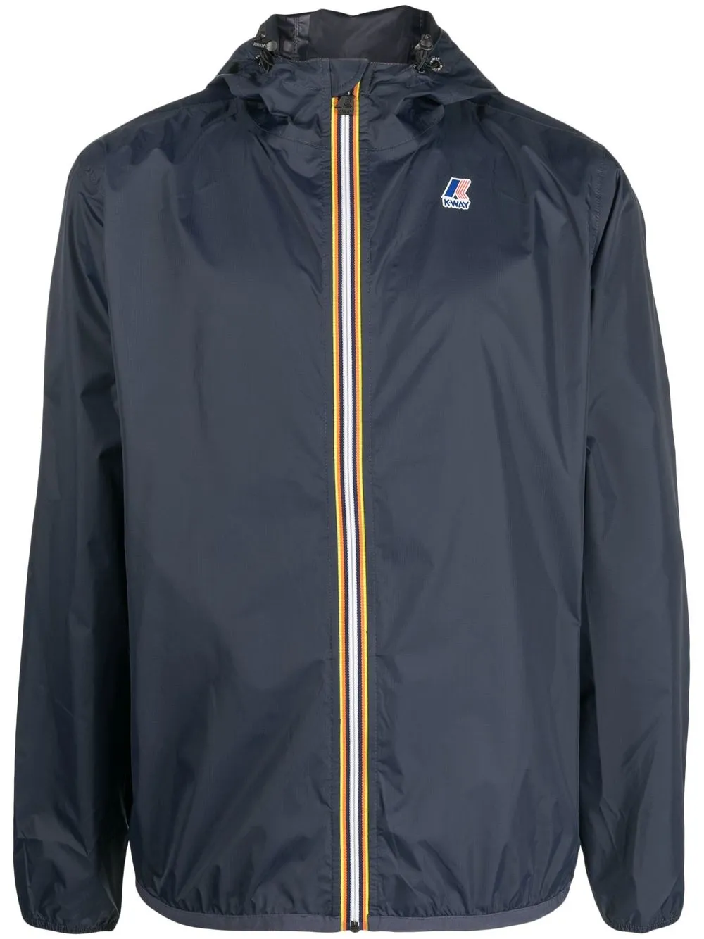 Bleu marine, étanche, hydrofuge, confection coupe-vent, patch poitrine à logo, capuche à lien de resserrage, détail de serrage élastique, fermeture zippée devant, coutures étanches, manches longues, poignets élastiqués, ourlet droit.