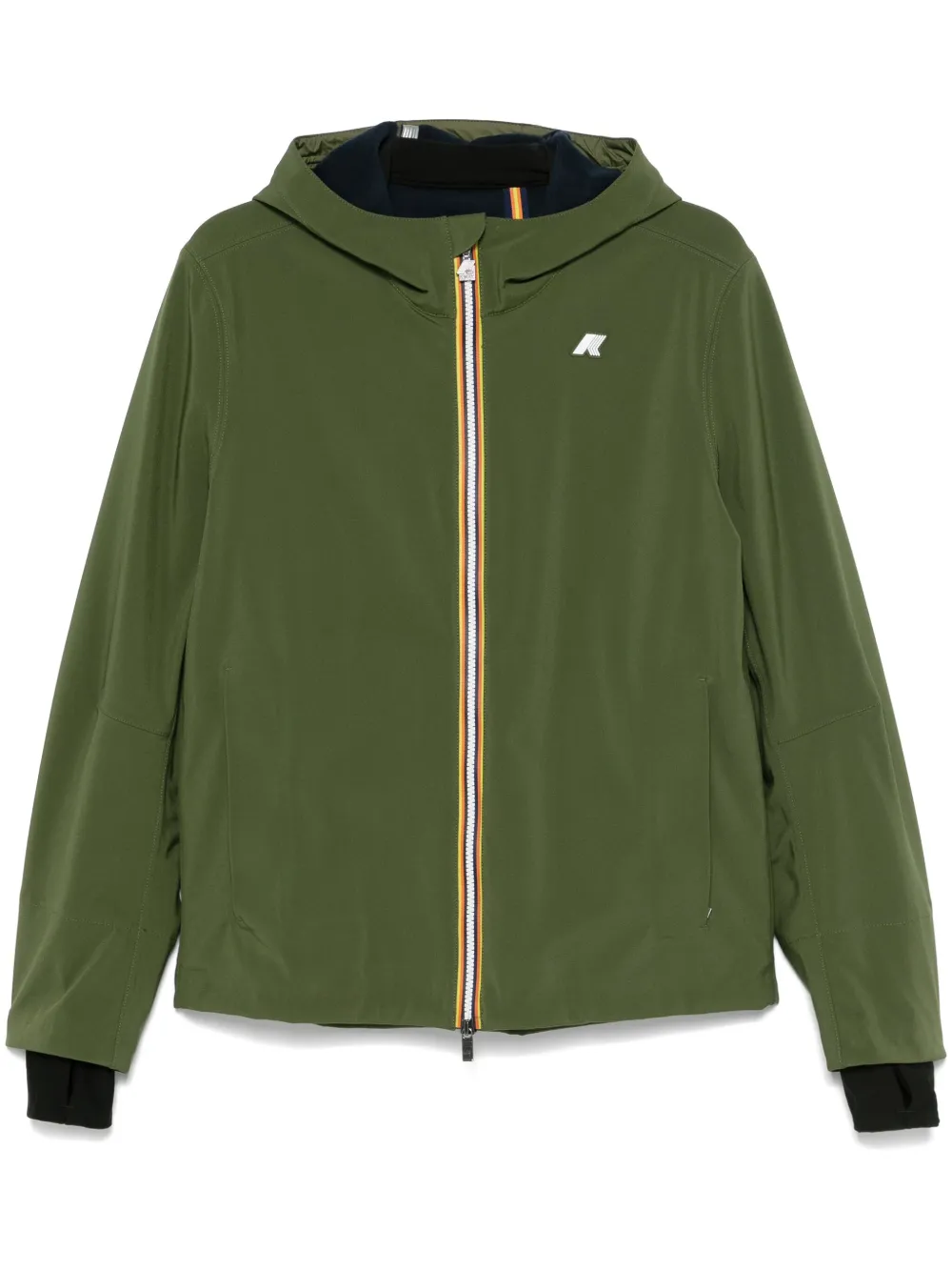 vert olive déperlant/imperméable coupe-vent fermeture zippée à double sens sur le devant capuche à lien de resserrage manches longues passe-pouce logo en caoutchouc détails rayé à l’avant deux poches latérales zippées poche intérieure zippée doublure en polaire ourlet à lien de resserrage QR code d’authenticité