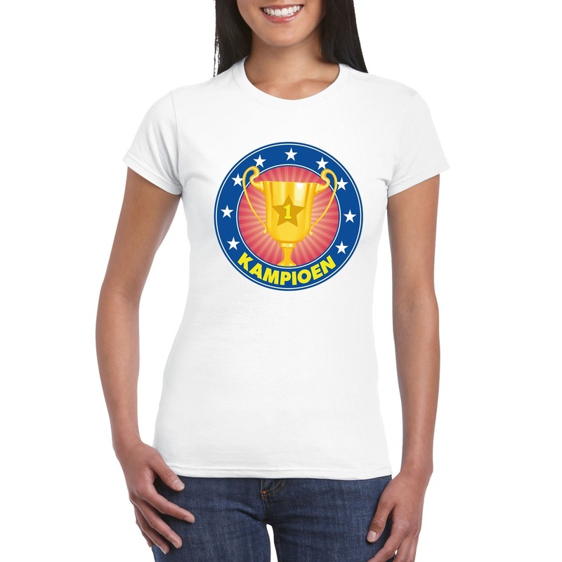Wit kampioen t-shirt voor dames. Op dit shirt staat een grote kampioen beker met de tekst: kampioen. Materiaal: 150 grams, 100% katoen.