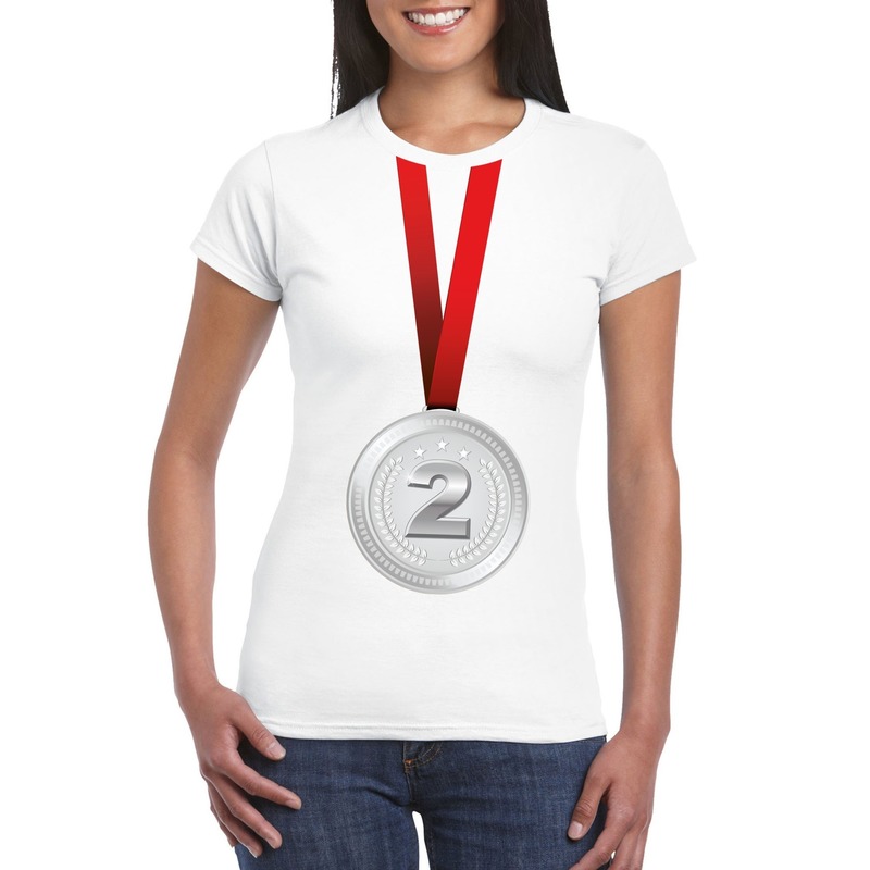 Zilveren medaille shirt wit dames voor de winnaar nummer 2. Op dit witte shirt staat een grote zilveren medaille aan rood lint gedrukt. Leuk als prijs voor de nummer 2 op een sportdag, bedrijfsuitje of ander evenement. Materiaal: 150 grams, 100% katoen.