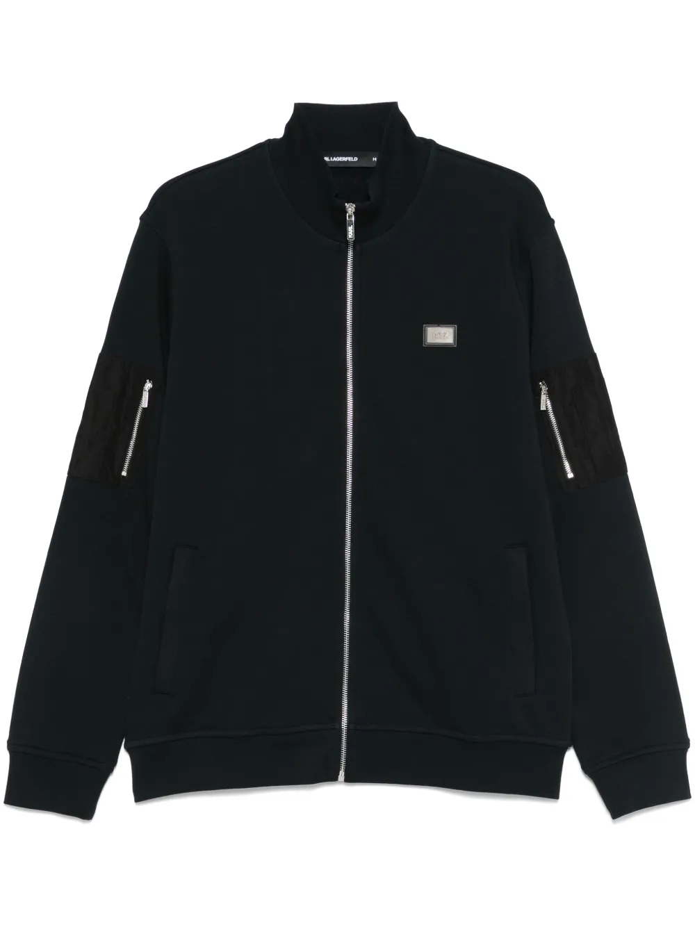 bleu marine fermeture zippée devant poche zippée sur la manche deux poches latérales zippées plaque logo argentée