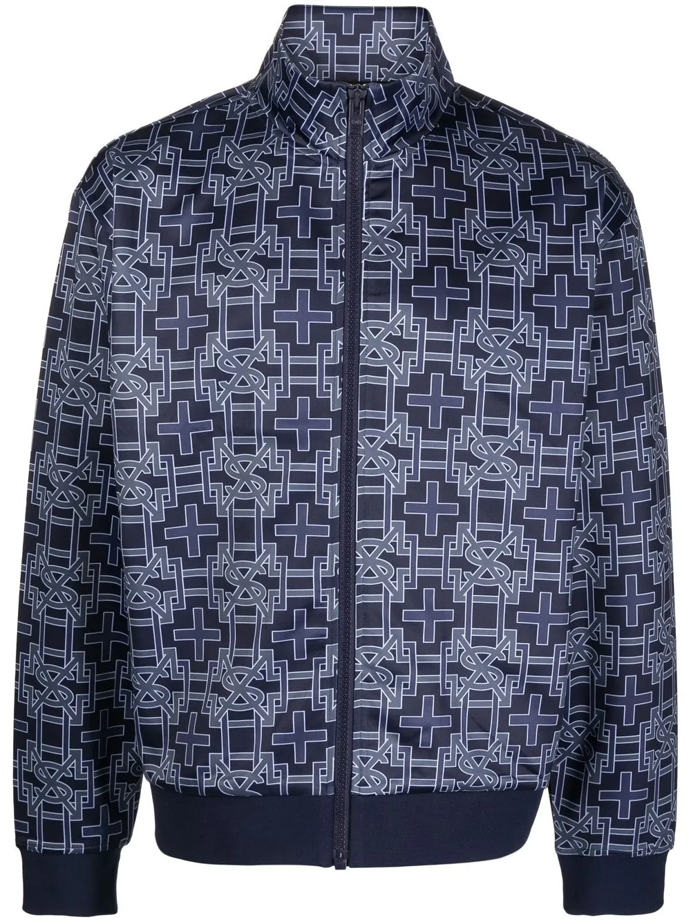 Bleu indigo, imprimé monogrammé, col montant, fermeture zippée devant, manches longues, manches à poignets resserrés, ourlet droit.