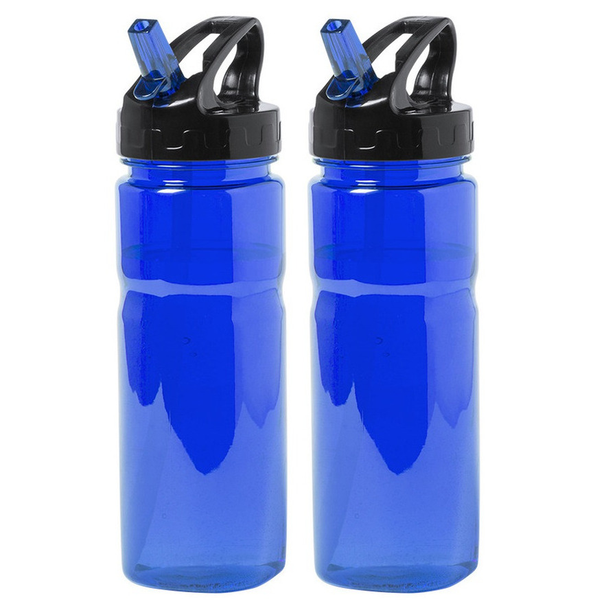 2x stuks kunststof waterfles/drinkfles/sportfles/bidon in de kleur blauw transparant met drinktuit en schroefdop. Afmeting: ca. D7 x H23 cm. Inhoud: ca. 650 ml. Gewicht: ca. 115 gram. Materiaal fles: Tritan kunststof. BPA-vrij: ja. Geschikt voor magnetron: ja. Geschikt voor vaatwasser: ja. Geschikt voor vriezer: ja. Sport bidon flessen voor kinderen en volwassenen.