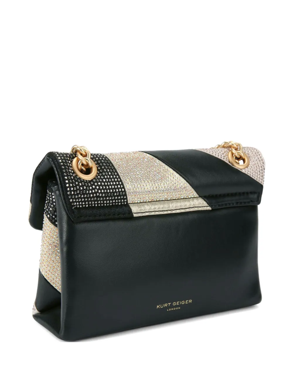 zwart-wit verfraaid met kristallen schouderband met schakels kenmerkend logodetail flapsluiting