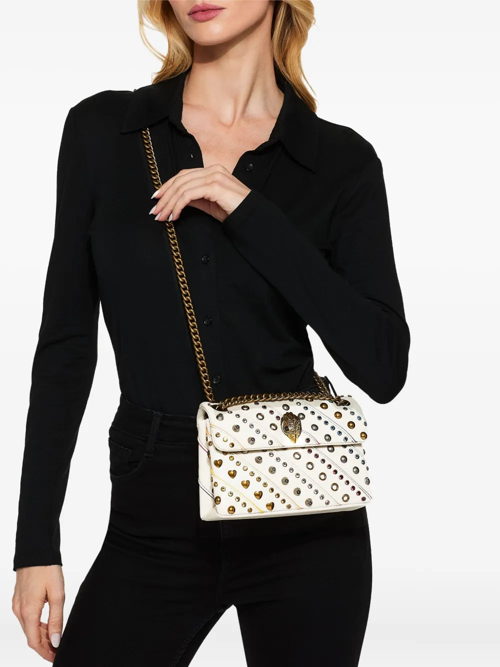 gebroken wit verfraaid met regenboogkristallen metalen studskettingbandje