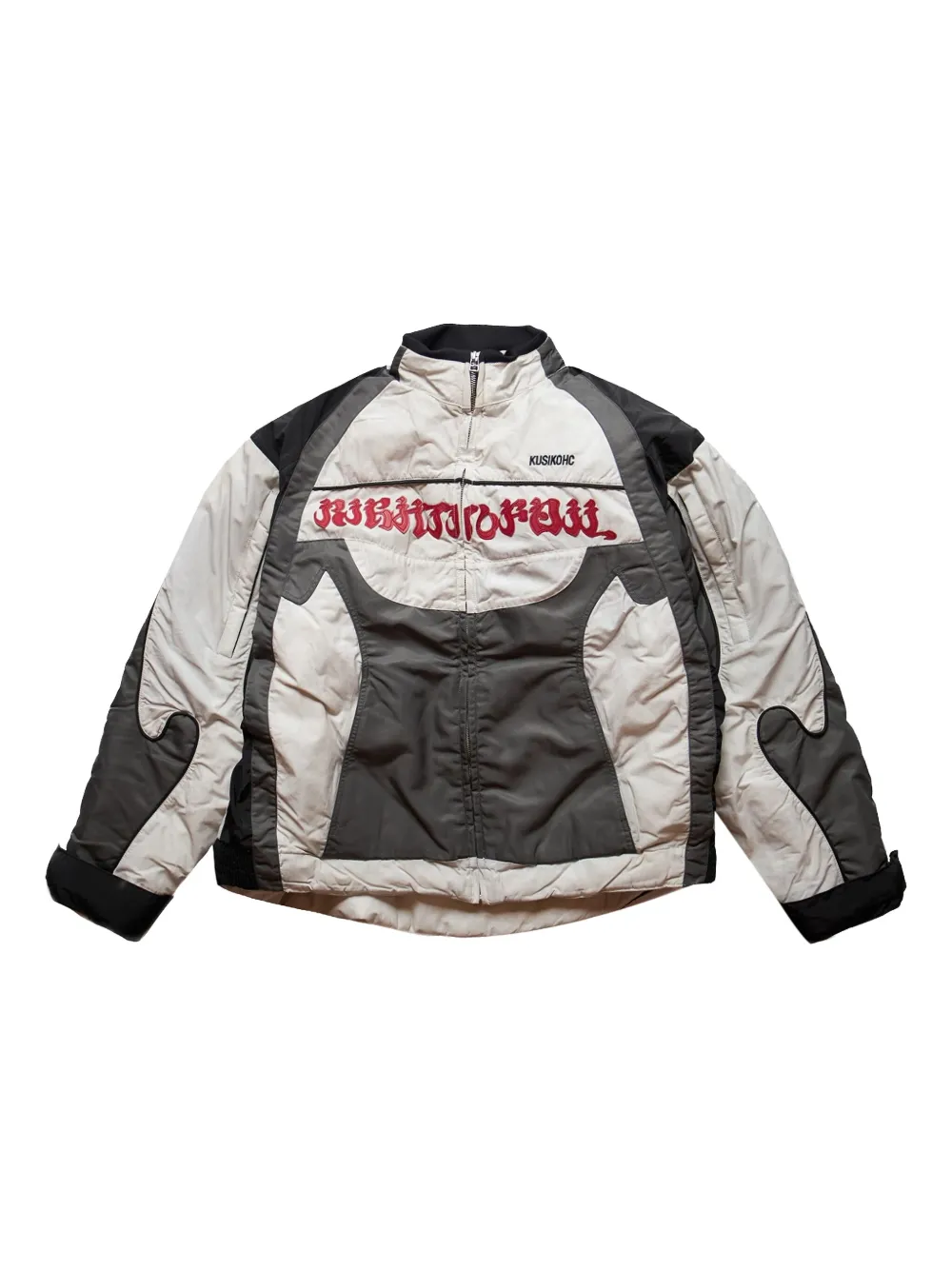gris clair fermeture dissimulée sur le devant col montant manches longues poche zippée sur la manche poignets à fermeture scratch logo brodé sur la poitrine deux poches latérales passepoilées patch logo sur l’arrière doublure intégrale