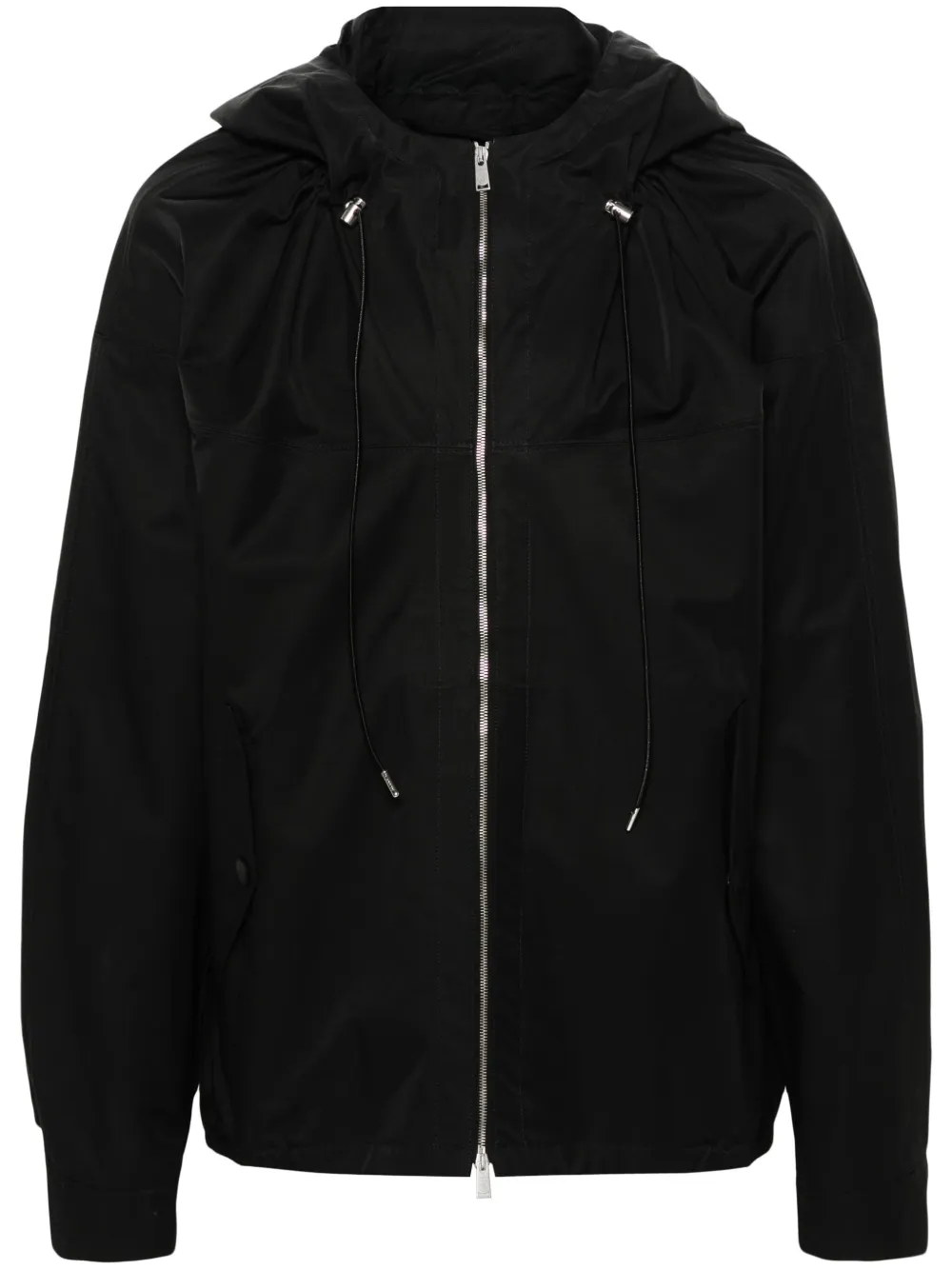 noir coton mélangé capuche à lien de resserrage manches longues poignets à boutons pression deux poches latérales à bouton pression ourlet élastiqué fermeture zippée à double sens sur le devant