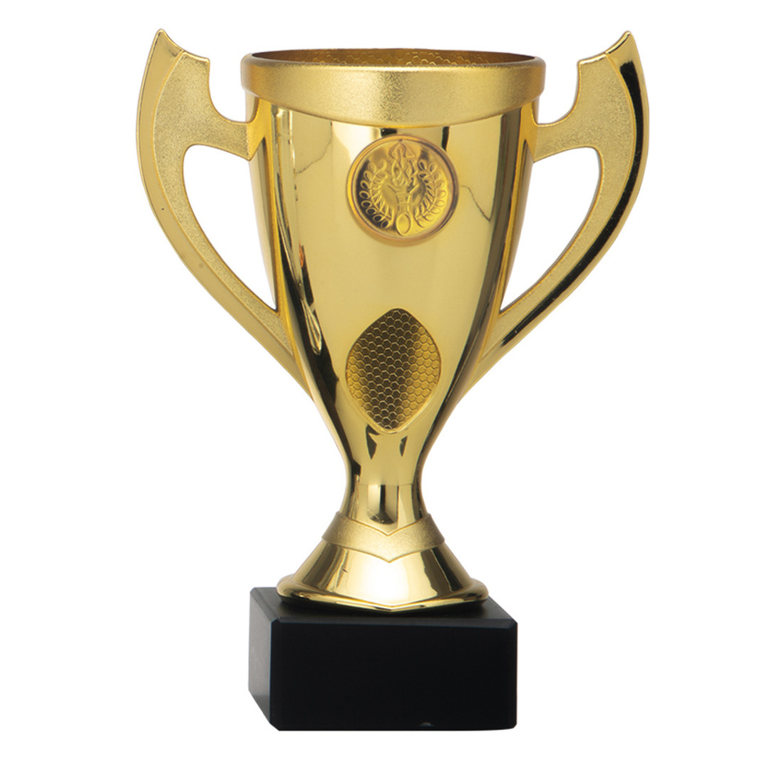 Luxe trofee / beker met oren in de kleur goud. De cup inclusief voetstuk is ca. 18 cm hoog, de diameter van de cup is ca. 9.5 cm. De trofee heeft geen tekst of afslag, maar heeft ruimte voor het zelf bevestigen van een afslag. Op het voetstuk is er ruimte om bijvoorbeeld zelf een sticker op te plakken. Deze cup/trofee is bij veel evenementen en wedstrijden geschikt, bijvoorbeeld bij sport-, muziek- en schaakwedstrijden, maar ook bij carnaval en bingo op de camping. Materiaal: kunststof. Sportprijs/Sportbeker/Wisselbeker/Bokaal.
