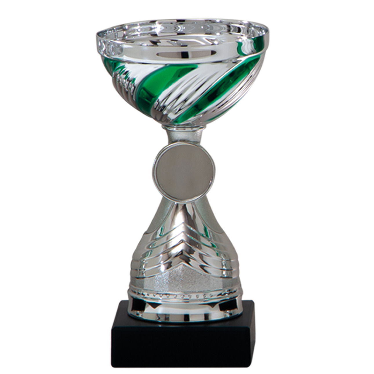 Luxe trofee / prijsbeker zilver met groene lijnen. De cup/beker inclusief voetstuk is ca. 19cm hoog, de diameter van de cup is ca. 10 cm. De trofee heeft geen tekst, maar heeft ruimte voor het zelf bevestigen van een afslag van ca. 2.5 cm. Op het voetstuk is er ruimte om bijvoorbeeld zelf een sticker op te plakken. Deze ruimte is ca. 7,5 x 2 cm. Deze cup/trofeebeker is bij veel evenementen en wedstrijden geschikt, bijvoorbeeld bij sport-, muziek- en schaakwedstrijden, maar ook bij carnaval en bingo op de camping. Materiaal: kunststof. Sportprijs/Sportbeker/Wisselbeker/Bokaal.