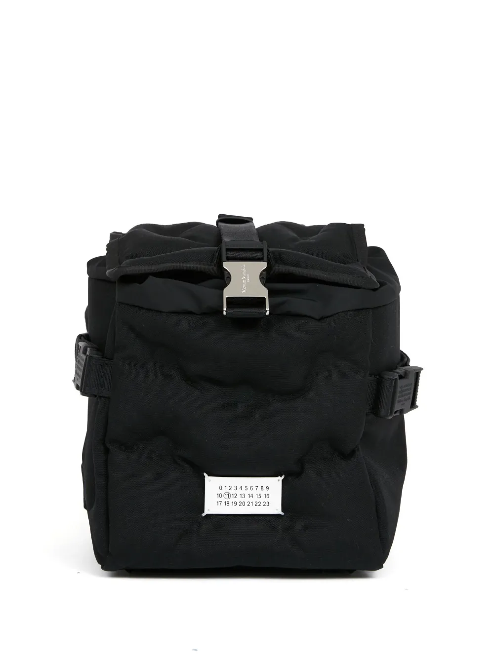 noir cuir de veau design matelassé logo numéroté signature patch logo sur le devant anse dessus brides portées épaules ajustables fermeture à boucles sur le dessus compartiment principal