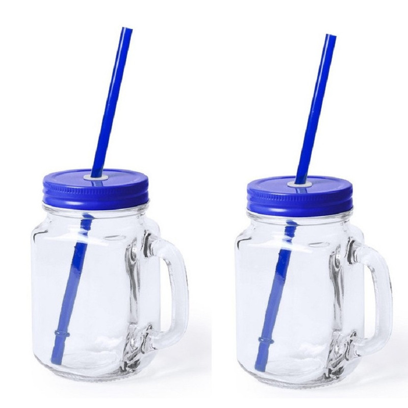2 stuks glazen Mason Jar drinkbekers/potjes met dop in het blauw, en rietje, met een inhoud van 500 ml. Limonade, Fruit shakes of andere drankjes anti lekken drinkpotten bekers. Formaat ongeveer: 7,5 x 13,5 cm. Let op: u ontvangt een willekeurig kleur rietje (doorzichtig of grijs).