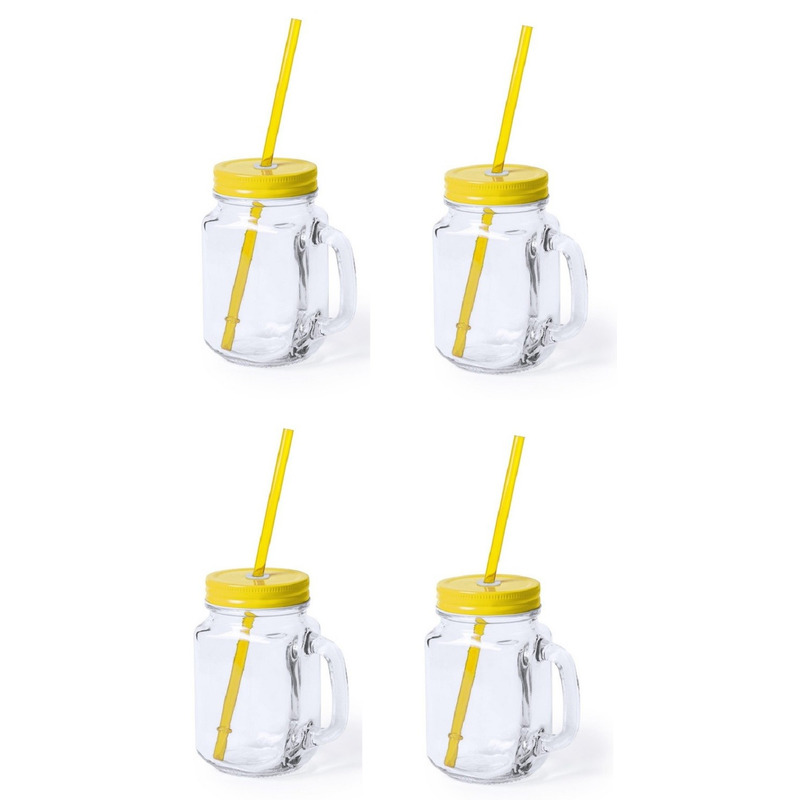 4 stuks glazen Mason Jar drinkbekers/potjes met dop in het geel, en rietje, met een inhoud van 500 ml. Limonade, Fruit shakes of andere drankjes anti lekken drinkpotten bekers. Formaat ongeveer: 7,5 x 13,5 cm. Let op: u ontvangt een willekeurig kleur rietje (doorzichtig of grijs).