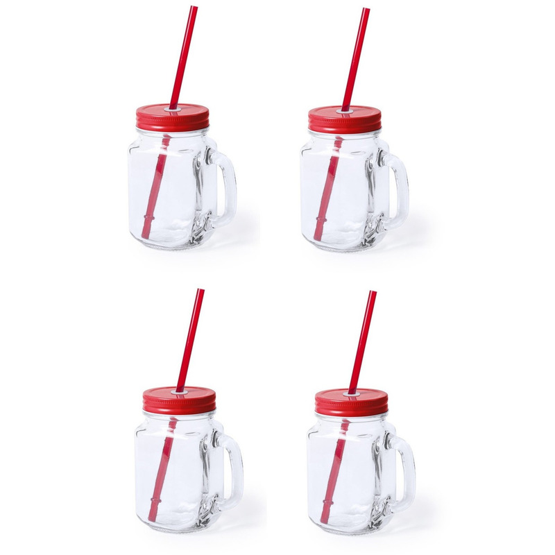 4 stuks glazen Mason Jar drinkbekers/potjes met dop in het rood, en rietje, met een inhoud van 500 ml. Limonade, Fruit shakes of andere drankjes anti lekken drinkpotten bekers. Formaat ongeveer: 7,5 x 13,5 cm. Let op: u ontvangt een willekeurig kleur rietje (doorzichtig of grijs).