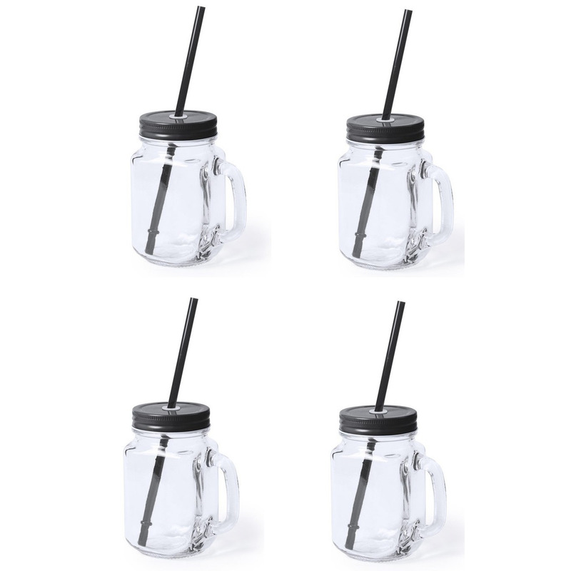 4 stuks glazen Mason Jar drinkbekers/potjes met dop in het zwart, en rietje, met een inhoud van 500 ml. Limonade, Fruit shakes of andere drankjes anti lekken drinkpotten bekers. Formaat ongeveer: 7,5 x 13,5 cm. Let op: u ontvangt een willekeurig kleur rietje (doorzichtig of grijs).
