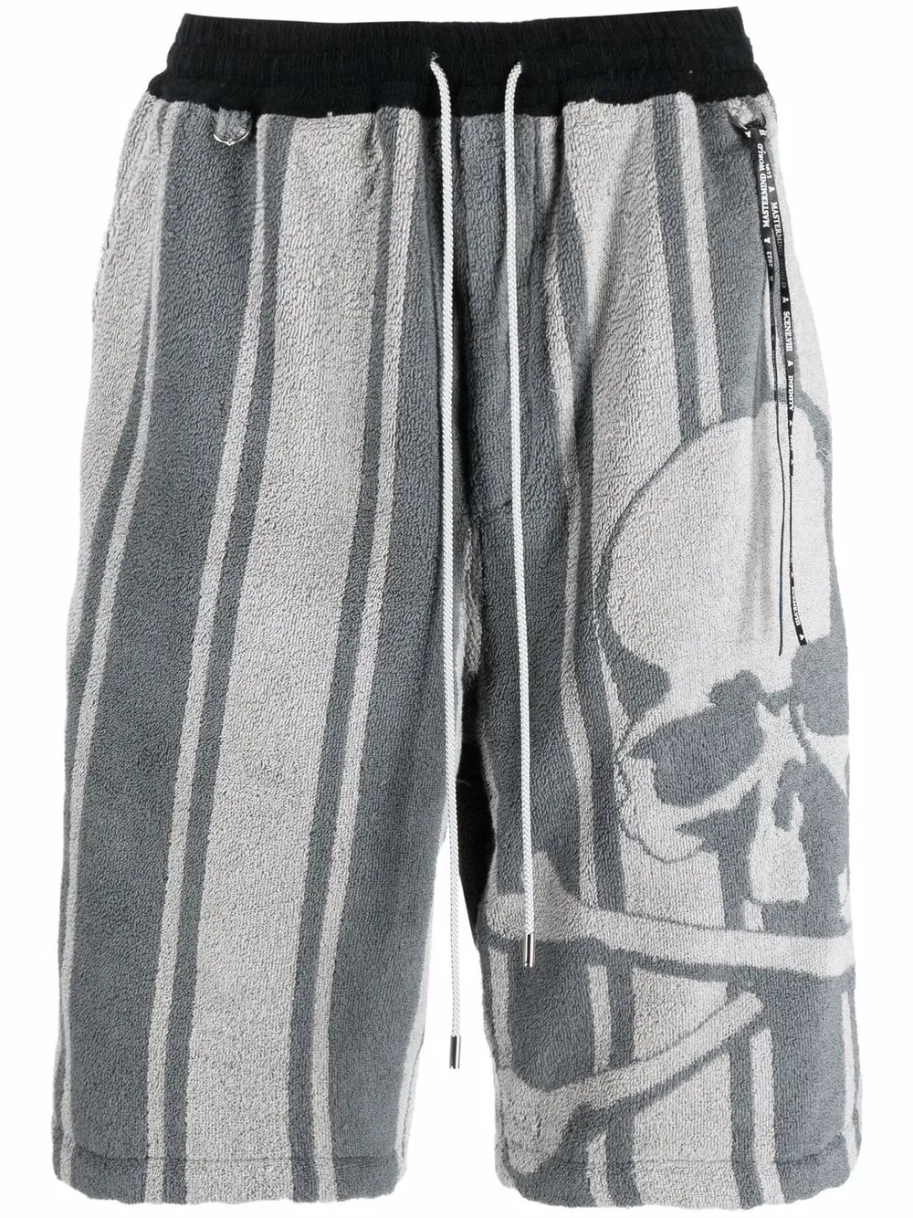 Rayures verticales, tête de mort brodée sur l’avant, taille à lien de resserrage, poches plaquées latérales, poches arrière plaquées, coupe droite. Matière : coton.
