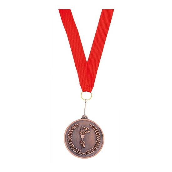 Medaille en of sport eerste prijs aan rood lint in de kleur brons. Een metallic brons medaille aan een rood lint voor de winnaar op de eerste plaats! Materiaal lint is polyester en het materiaal van de bronsen medaille is metaal. Sportprijs / sportprijzen eerste plaats.