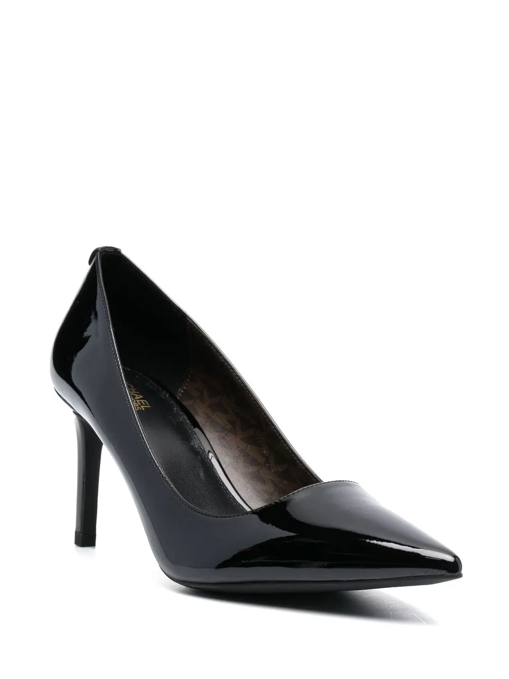 Zwart, glanzende finish, puntige neus, slip-on stijl, hoge hak, binnenzool met merk en rubberen zool.