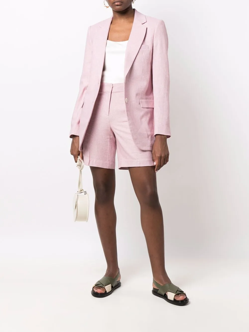High-waist, getailleerde fit, straight-fit, verborgen sluiting aan de voorzijde , riemlussen, twee paspelzakken aan de achterkant en lengte tot boven de knie. Materiaal: katoen.