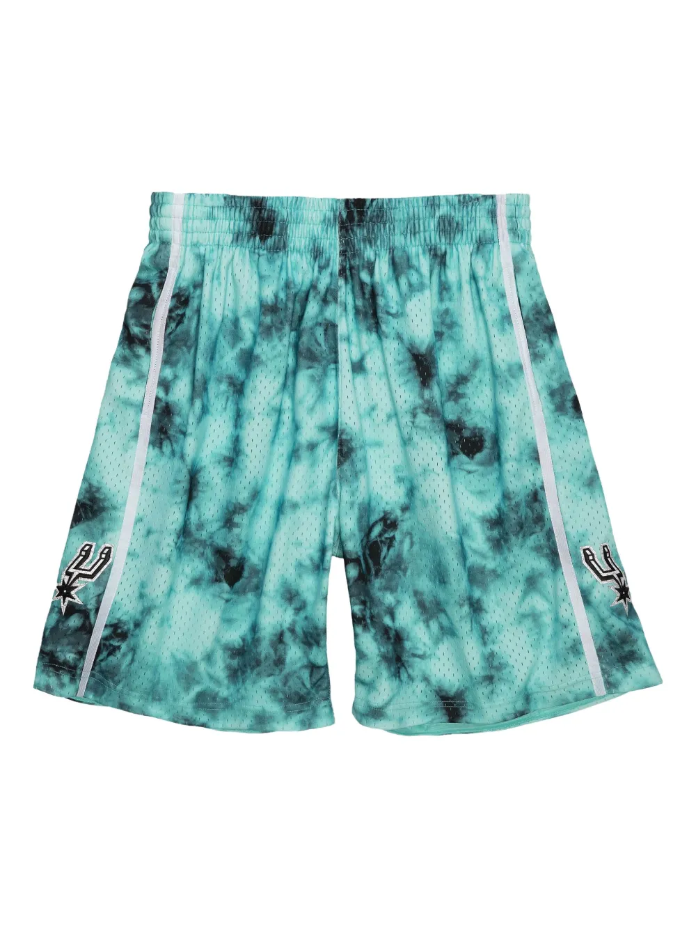 bleu sarcelle imprimé abstrait ceinture élastique poches latérales fendues détails rayés logo imprimé sur le côté