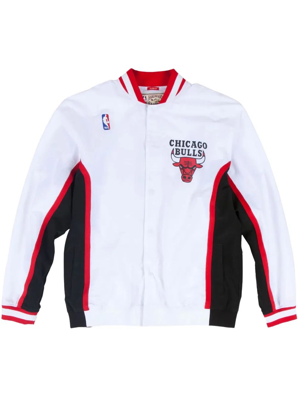 blanc fermeture dissimulée sur le devant col baseball manches longues deux poches passepoilées latérales design colour block appliqué logo bordure rayée ourlet droit