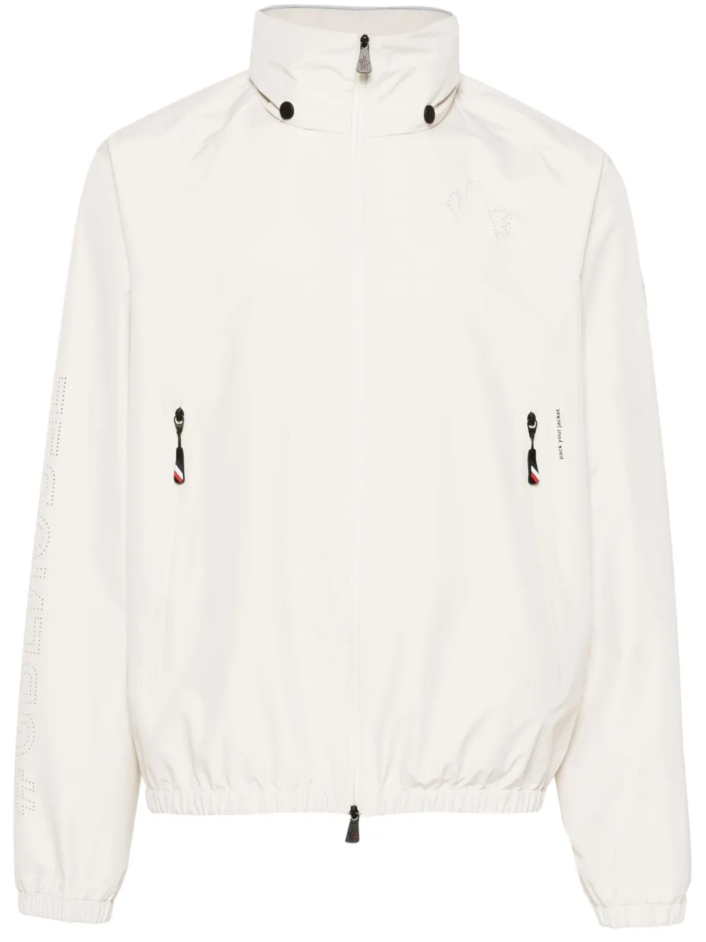 beige clair texture tissu indéchirable capuche dissimulée logo perforé sur le devant et l’arrière col cheminée fermeture zippée à double sens sur le devant zip à logo manches longues patch logo sur la manche poignets élastiqués poches à fermeture zippée devant ourlet droit élastiqué