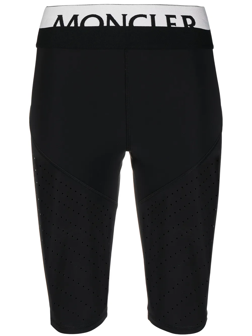 Détails de perforations, ceinture élastique, taille haute, coupe stretch, hauteur genou, détail de rayure latérale.