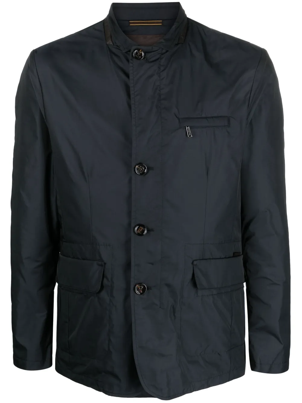 Bleu nuit, col cassé, fermeture à zip et boutons sur le devant, poche poitrine zippée, deux poches à rabat sur le devant, manches longues, fente arrière.