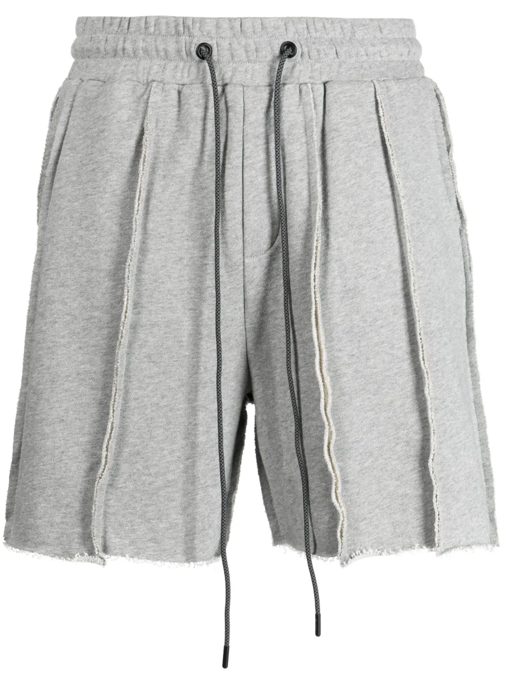 Gris clair, coton, taille élastique à lien de resserrage, coutures apparentes, finitions à bords francs, patch logo sur l’arrière, deux poches latérales fendues, deux poches passepoilées à l’arrière, coupe courte.