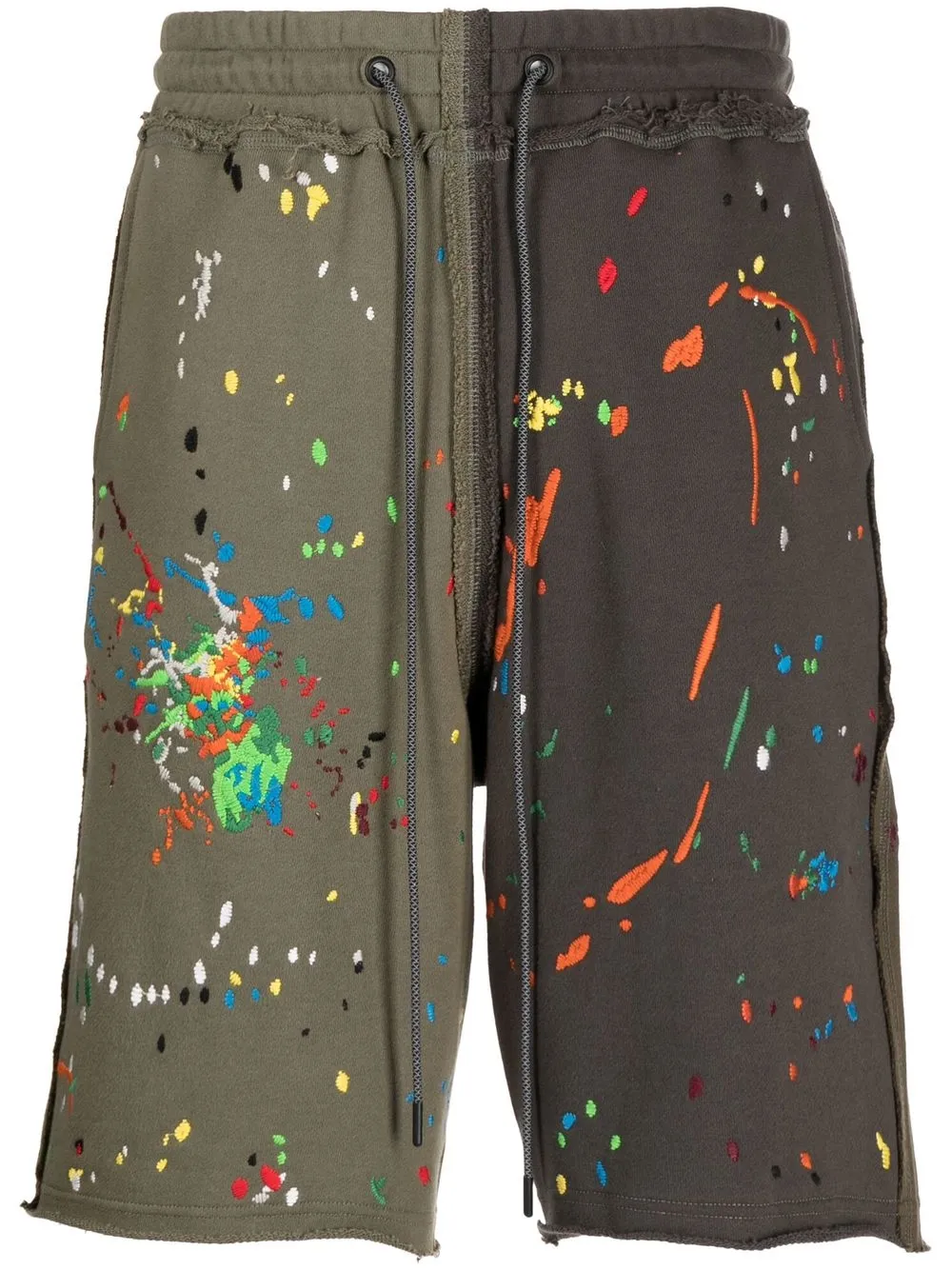 Vert militaire, coton, tricot point jersey, bords francs, design à empiècements colour block, broderies, effet taches de peinture, taille élastique à lien de resserrage, poches latérales fendues, poches arrière passepoilées, hauteur genou.