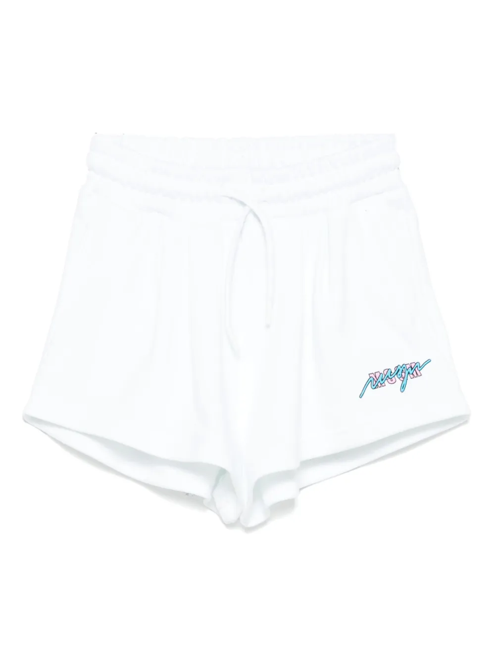 blanc taille élastique à lien de resserrage deux poches latérales passepoilées logo imprimé sur la cuisse
